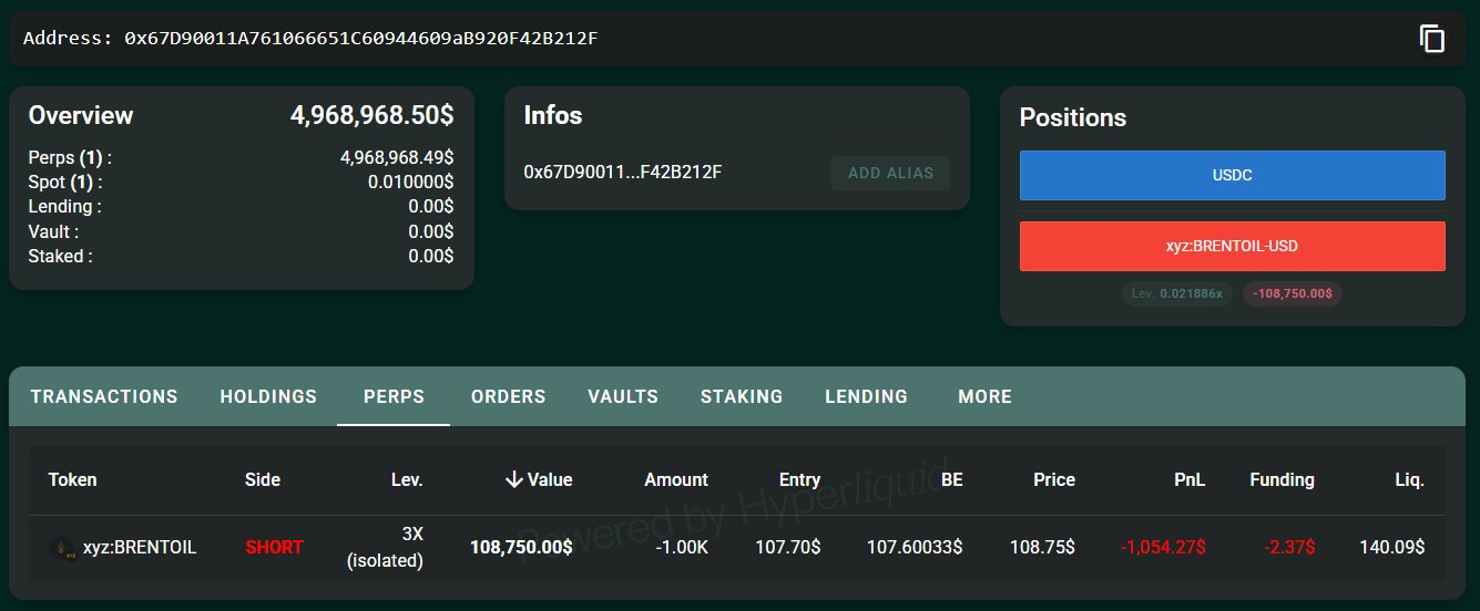 深潮 TechFlow 消息,4 月 2 日,據鏈上數據分析平臺 Onchain Lens(@OnchainLens)監測,一個創建僅 2 周的錢包向去中心化衍生品平臺 HyperLiquid 存入 497 萬美元 USDC,並以 3 倍槓桿開設了一筆小額布倫特原油(BRENTOIL)空頭倉位。