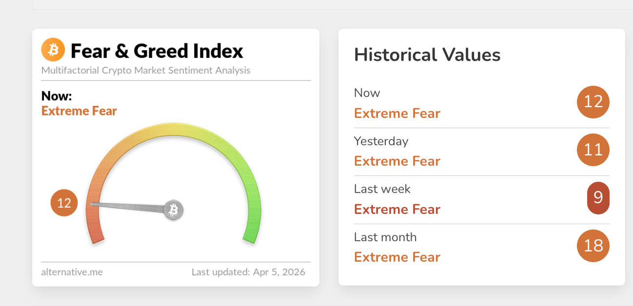 深潮 TechFlow 消息,04 月 05 日,據 Alternative 數據顯示,今日加密貨幣恐慌與貪婪指數升至 12,昨日該指數為 11,市場仍處於「極度恐慌狀態」。
