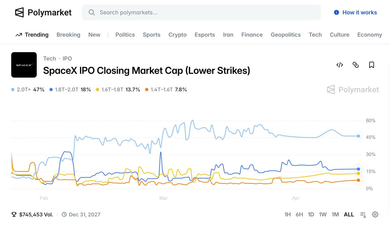 深潮 TechFlow 消息,04 月 15 日,據 Polymarket 預測市場頁面顯示,當前 SpaceX IPO 收盤市值預測中,2 萬億美元以上區間概率約為 47%,為最高概率選項;其後分別為 1.8 萬億至 2 萬億(18%)、1.6 萬億至 1.8 萬億(13.7%) 及 1.4 萬億至 1.6 萬億美元(7.8%)。
