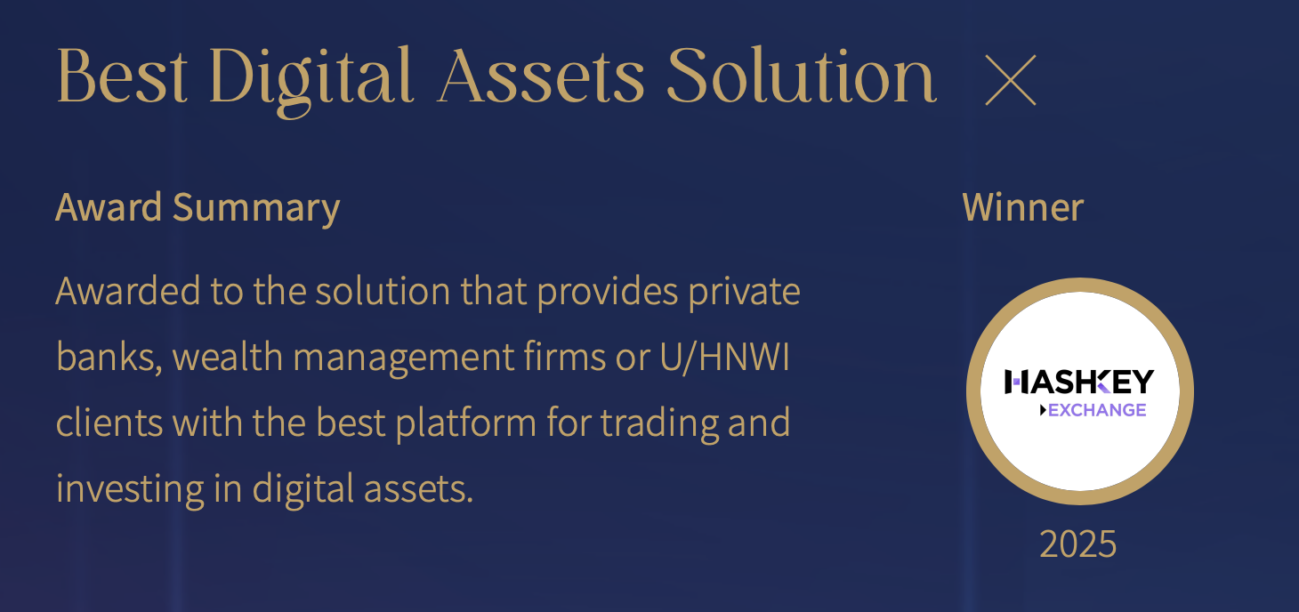 《亞洲私人銀行家》是亞太財富管理領域的權威機構,其“最佳數字資產解決方案”獎項旨在表彰為私人銀行、財富管理機構或超高/高淨值(U/HNWI)客戶提供最佳數字資產交易與投資平臺的卓越解決方案。 此次再度蟬聯殊榮,不僅是對 HashKey Exchange 全方位機構服務能力的肯定,也是對其在複雜市場環境中始終保持穩健運營與穿越週期韌性的深度認可。